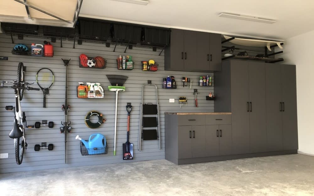 Wall-mounted cabinets: In terms of heavy-duty solutions for garages that double as oversized tool sheds, cabinets will keep your more unsightly items out of view and are a great selling point should you ever list your home for sale.